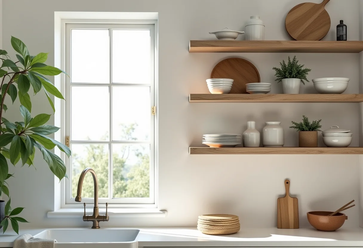 • Cozinhas Minimalistas: Prateleiras de madeira suspensas, poucos objetos e cores claras.