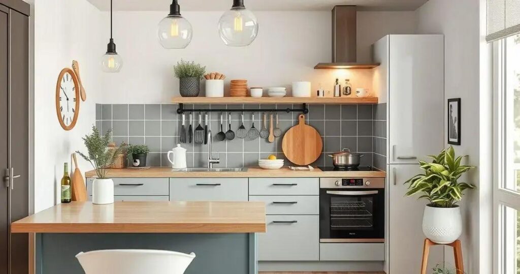 Preparei um guia completo com 10 truques de otimização de espaço cozinha pequena que vão te ajudar a transformar sua cozinha em um ambiente funcional e super charmoso.